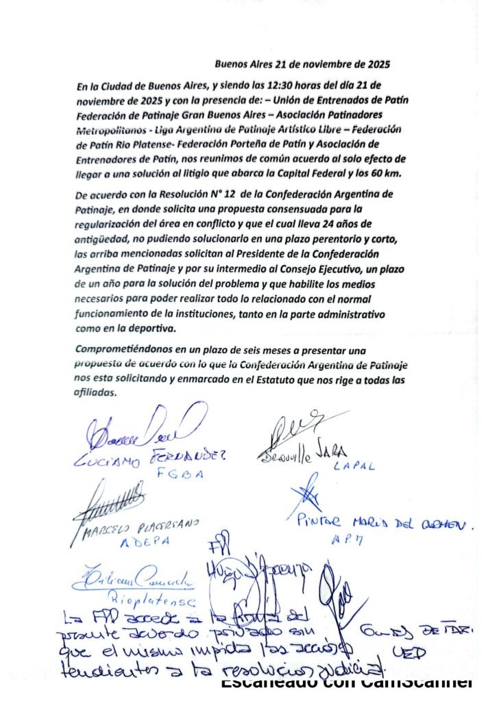 En mi carácter de Presidente y en conjunto con el Consejo Directivo de la Federación Porteña de Patín (FPP), entidad fundadora de esa Confederación desde el año 1939, con personería jurídica vigente, estatuto aprobado, libros rubricados ante IGJ y reconocimiento expreso por la propia CAP, venimos a rechazar formal, expresa, categórica y enérgicamente el comunicado y la Resolución N° 12 de fecha 7/11/2025 emitida por esa Confederación, por resultar ilegal, arbitraria, violatoria del Estatuto Confederativo y de derechos adquiridos, además de constituir una grave intromisión institucional en un conflicto sub iudice.